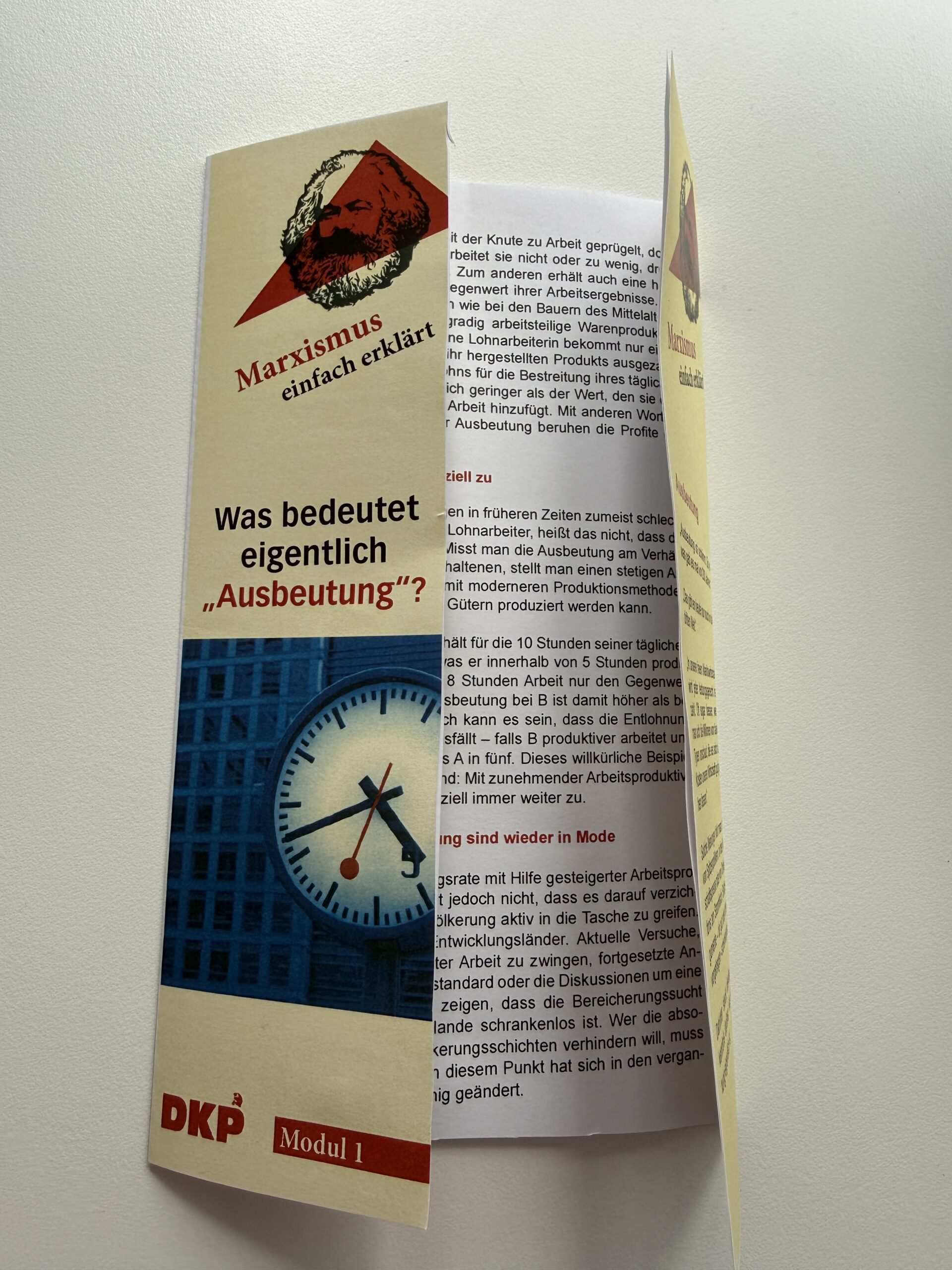 Hier findest Du zukünftig kleine Bildungsmodule: Kurze Texte in klarer Sprache, maximal eine A4 Seite lang. Verbunden mit einem Büchertipp zum weiterlesen. Das ganze in der Form eines gut gestalteten Flyers. Gedacht als „Marxismus to Go“ – eingestreut in unsere Aktionstätigkeit. Gut geeignet auch für den Infotisch. Das erste Modul ist fertig.